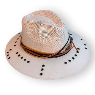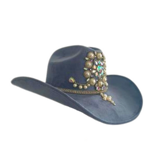 Sombrero vaquero texana de gamuza con aplicación de cristales, piedras, cadena e iniciales